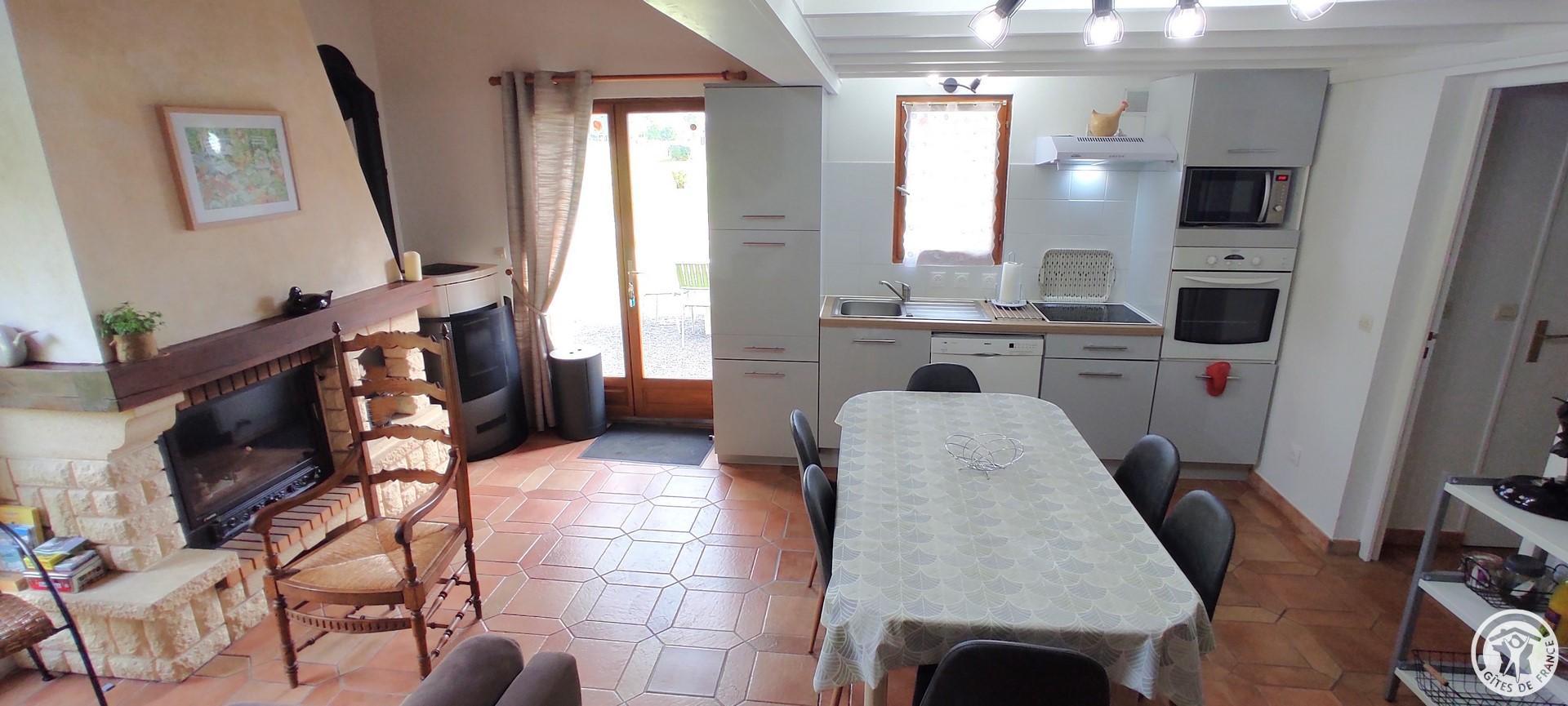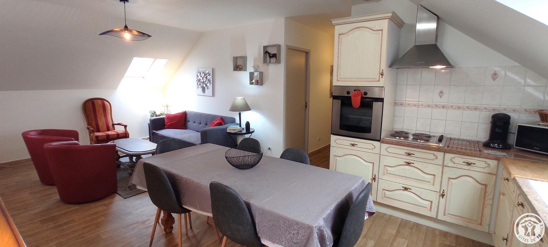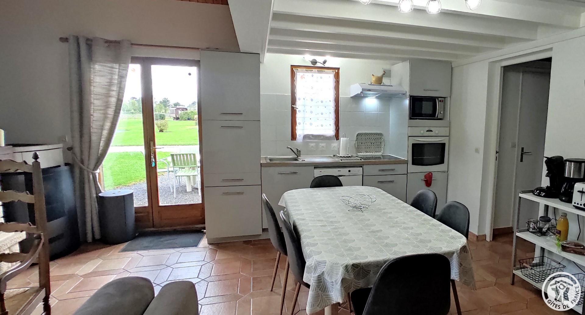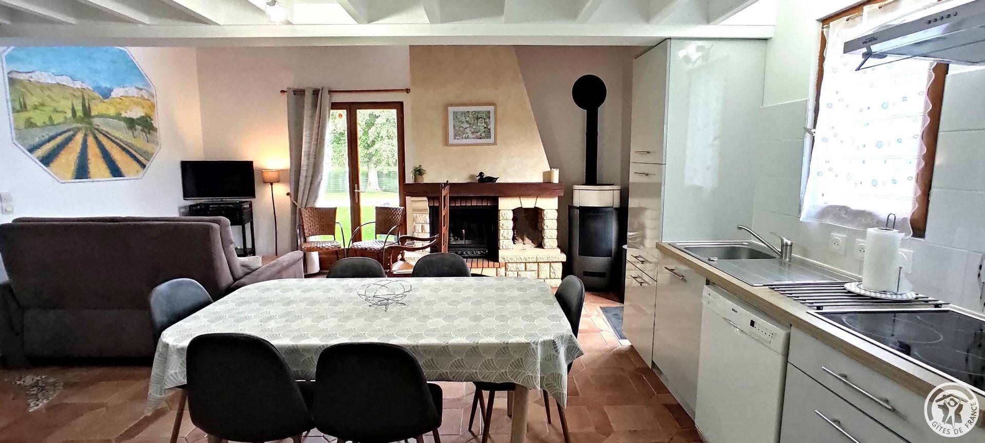 Ce gîte est aménagée en rez-de-chaussée, vous entrez dans la pièce de vie composée d'un salon ouvert sur la cuisine équipée avec coin repas.