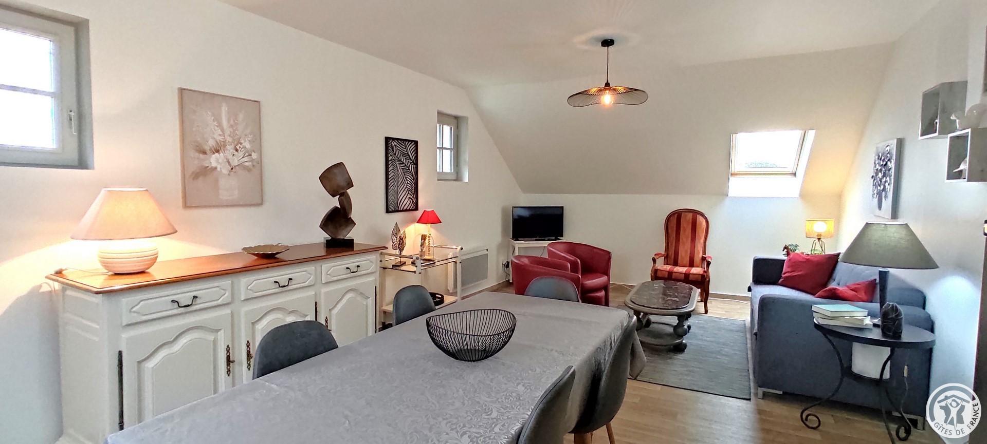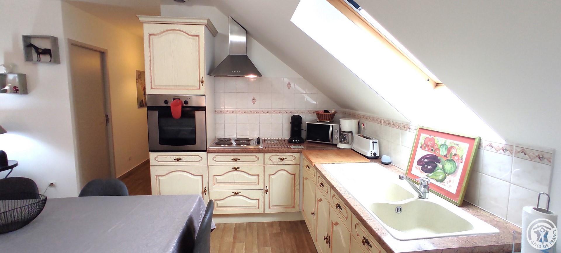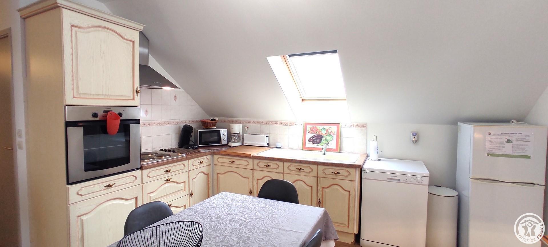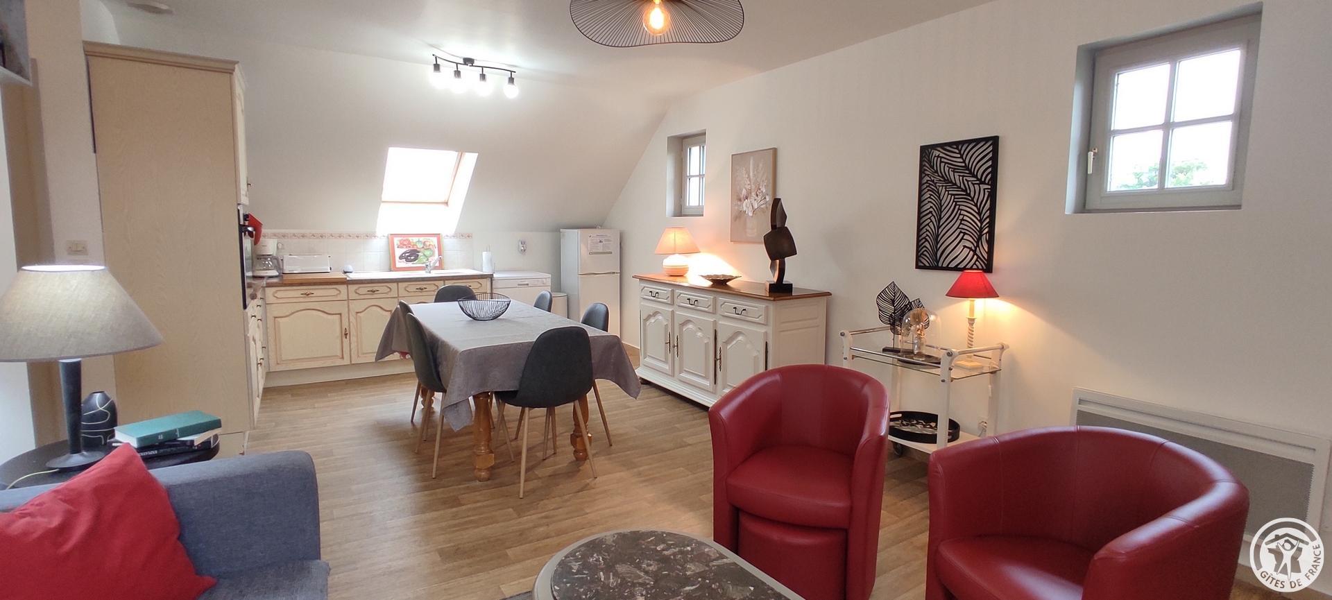 Ce gîte est aménagée en rez-de-chaussée, vous entrez dans la pièce de vie composée d'un salon ouvert sur la cuisine équipée avec coin repas.